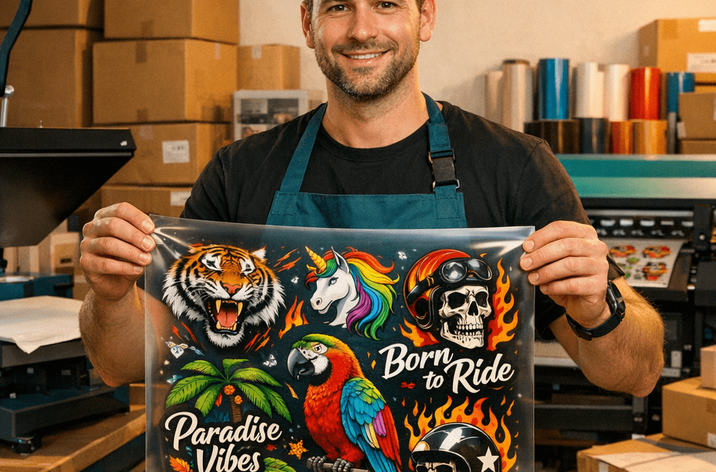 • Specialty finishes like Glitter DTF and UV DTF stickers for premium merch.