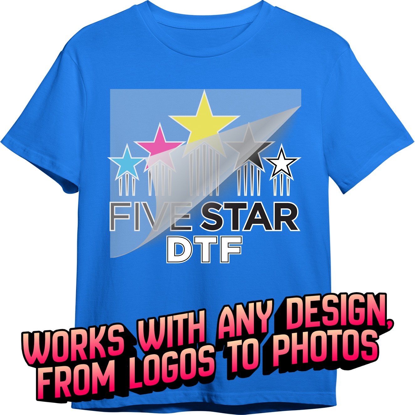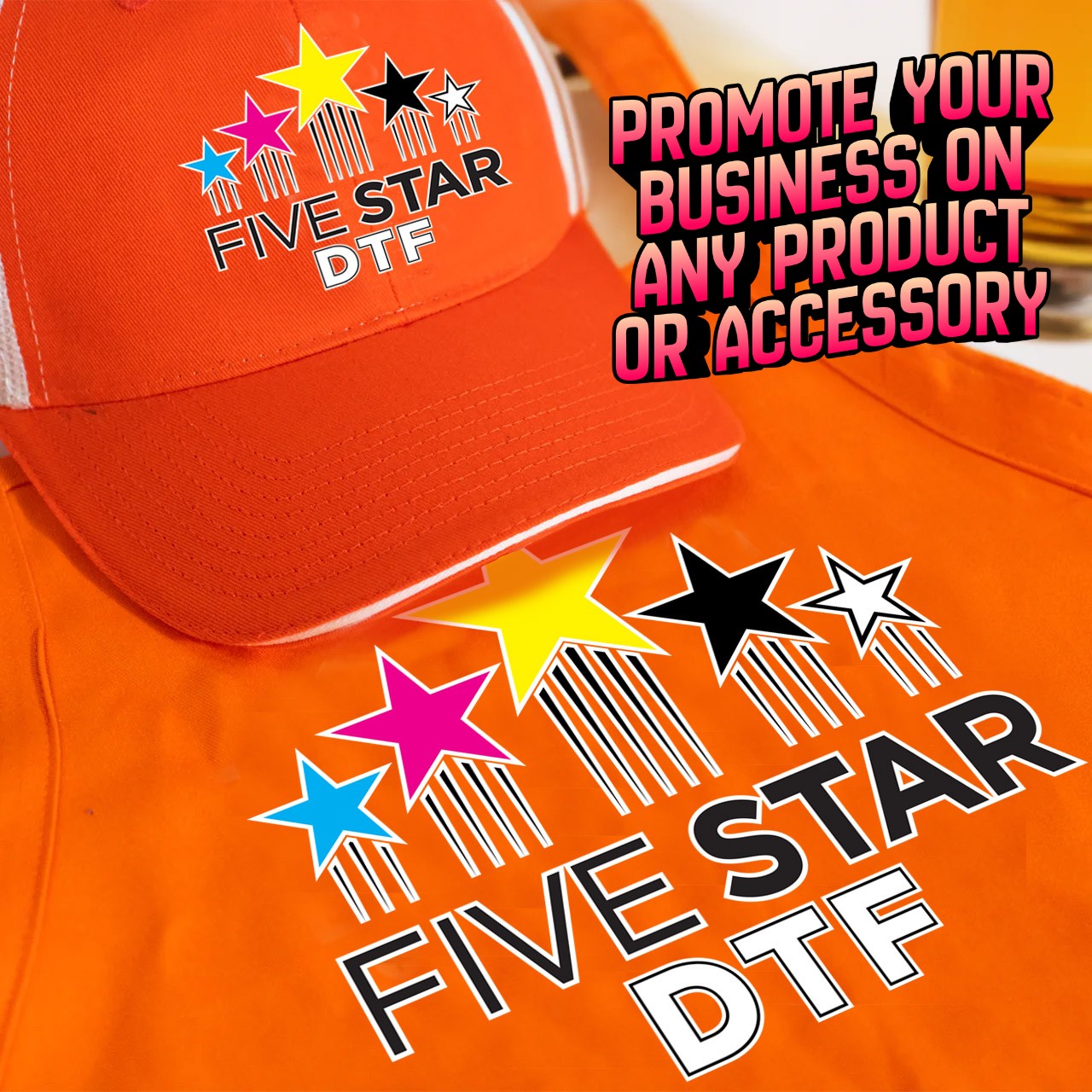 Skip the limitations of vinyl and sublimation — experience faster turnaround, richer color, and lasting quality with Five Star DTF Transfers.
